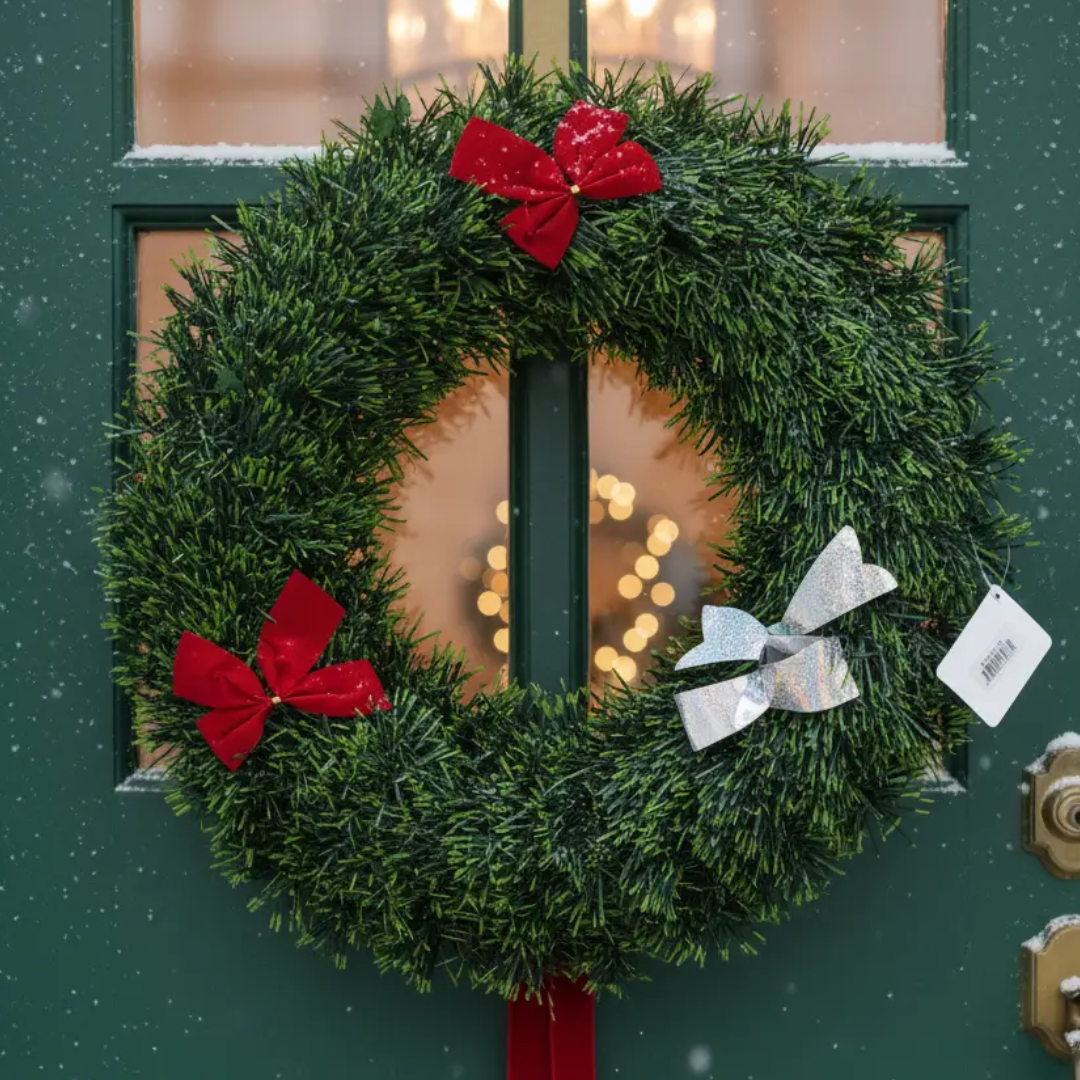 Corona navideña para puerta con lazos rojos, diseño clásico y decorativo. Aporta calidez y estilo festivo a tu hogar, ideal para entradas, paredes o interiores. Decoración durable y lista para colgar.