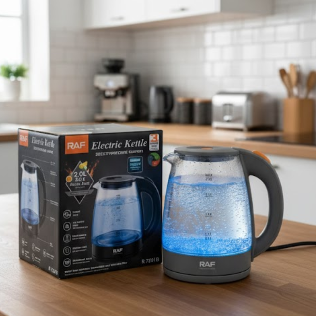 Jarra eléctrica de vidrio RAF de 2 litros, ideal para hervir agua de forma rápida y segura. Su diseño transparente permite ver el nivel de agua, mientras que su base y tapa ofrecen comodidad.