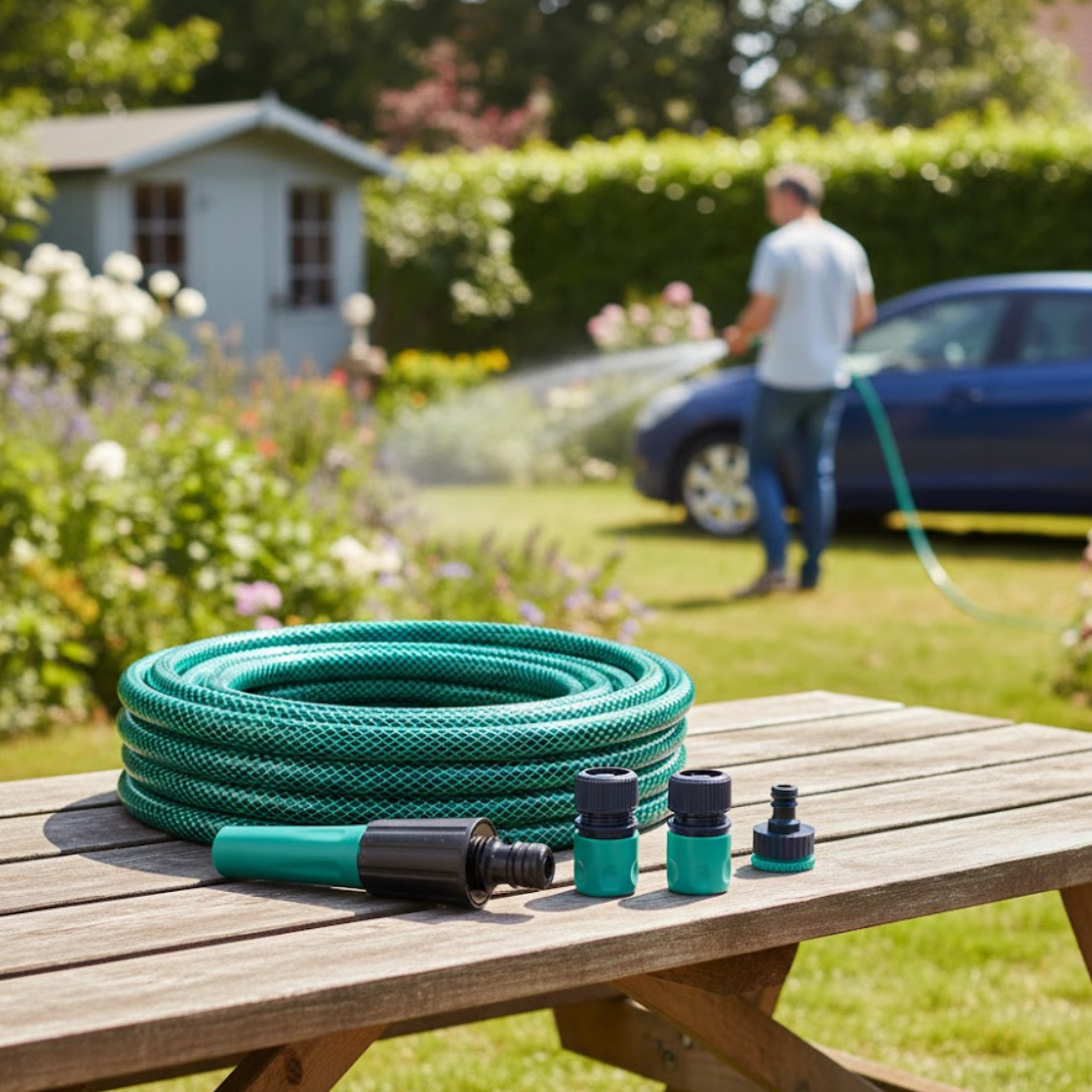 Manguera de jardín de 15 metros con acoples intercambiables, práctica y resistente para regar plantas, limpiar exteriores o realizar otras tareas de jardinería. Flexibilidad y durabilidad.