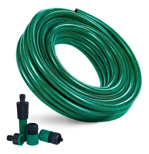 Manguera de 20 m resistente y flexible, incluye 4 cabezales intercambiables para distintos tipos de riego, ideal para jardín, limpieza y uso doméstico.
