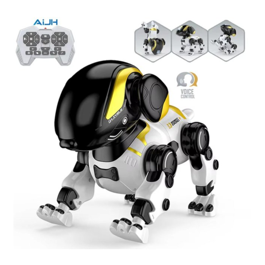 Perro robot interactivo con diseño moderno y divertido. Emite sonidos y realiza movimientos, estimulando el juego y la imaginación. Ideal como compañero de juegos para niños.