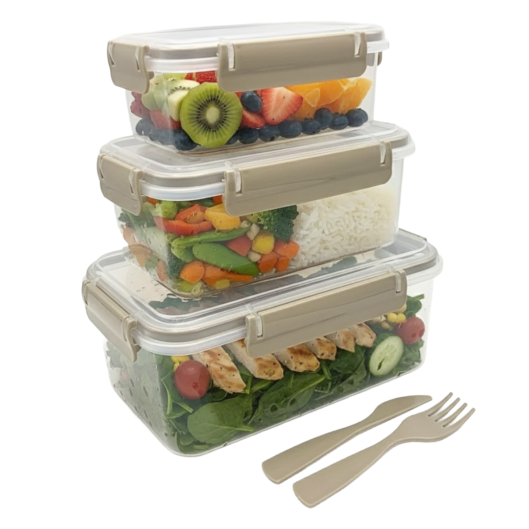 Set de 3 tuppers S51130 con tapas seguras y cubiertos incluidos, diseñado para llevar comidas con comodidad. Ideales para oficina, escuela o viajes. Prácticos, apilables y fáciles de limpiar.