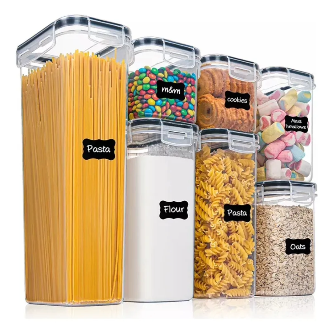Set de siete recipientes herméticos transparentes para cocina, ideales para organizar pasta, harina, cereales y dulces. Diseño apilable con tapas seguras y etiquetas visibles.