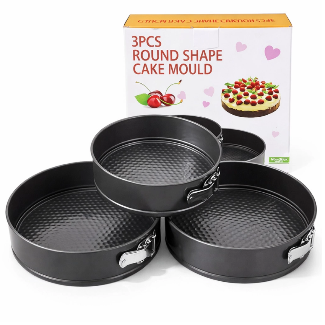 Set de 3 torteras desmontables de distintos tamaños. Ideales para preparar tortas, cheesecakes y postres. Material resistente con base removible para desmoldar fácil y lograr una cocción pareja.